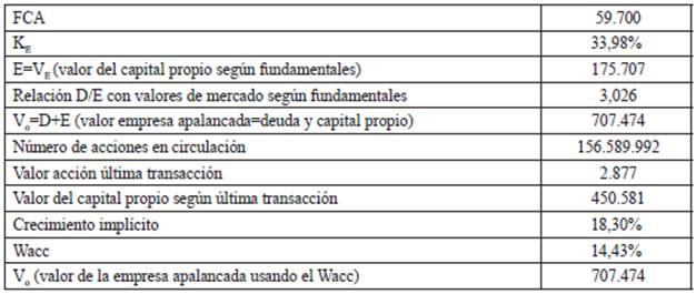 Con fines meramente académicos, podemos hacer un análisis de la operación a la luz de los fundamentales de la empresa y determinar cuál es la tasa de crecimiento implícito asociada al valor de la prima. Para tales efectos, calculamos el FCA restando del Nopat el valor de los intereses pagados y sumando el beneficio tributario. Se usa la misma técnica del cálculo interactivo presentada anteriormente para apalancar el B^ empezando con una relación D/E calculada con el saldo de la deuda actual y el capital propio resultante de la restarle al CIO el valor de tal deuda. Usando el ER como medida de CR y después de 15 iteraciones el KE converje a 33,98% y el valor del capital propio pasa a 175,707 millones de pesos, tal como se observa en la tabla 8.