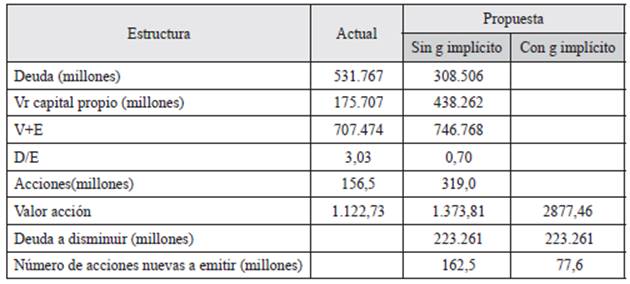 En la tabla 9, se muestra una propuesta de recapitalización para acceder a la estructura óptima de capital hallada. Se cambiarían 223.261 millones de pesos de deuda por capital propio obtenido de una nueva emisión. Sin el crecimiento implícito serían de 162,5 millones de acciones, pero si se mantiene la prima en colocación anterior, serían de 77,6 millones de acciones. Con ello se incrementaría el valor de la empresa apalancada cerca de 40.000 millones de pesos. Nótese que el valor de la acción con la estructura propuesta se incrementa en un 22,4% frente al valor que resulta de valorar la empresa con la estructura actual de endeudamiento.