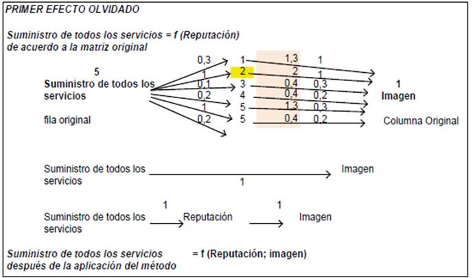 Posteriormente, se elabora la función de incidencia de la variable afectada (f(x) = Y) con la opinión de los expertos (matriz original), luego se analiza la variable causa con la variable efecto que resultó olvidada en la matriz de diferencia para determinar cuál es la variable que produce el efecto secundario olvidado. Se procedió de la siguiente manera: