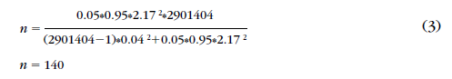 Tomando un nivel de confianza de 97% (Z = 2.17) y un error máximo permisible E = 4%, tenemos la ecuación 3.