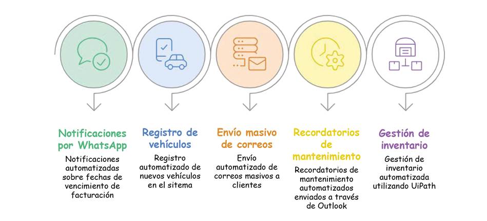 Asimismo, se incorporó el envío de correos masivos con promociones y servicios a la cartera de clientes, lo que optimizó las estrategias de marketing. Para reforzar el servicio posventa, se programaron recordatorios automáticos de mantenimiento a través de Outlook, que mejoraron la experiencia del cliente, al asegurar el cumplimiento de estos servicios. Por último, mediante el uso de UiPath, se automatizó la gestión del inventario y, así, se logró mantener la información actualizada, reducir errores manuales y mejorar la planificación operativa.