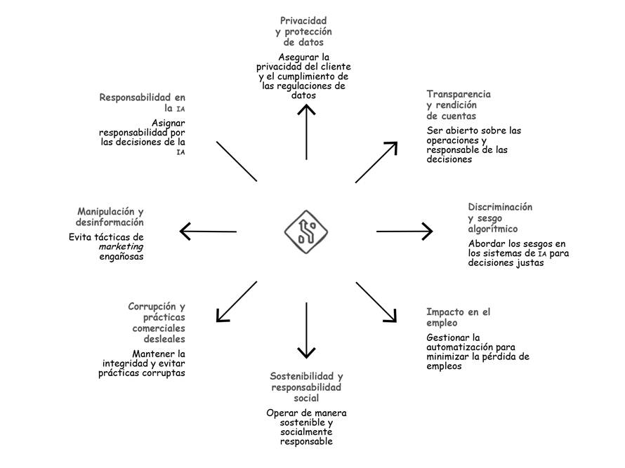 La revisión de la literatura de esta investigación evidencia una creciente preocupación por los dilemas éticos que emergen con la implementación de sistemas de IA en las organizaciones. García-Vigil (2021) y Camilleri (2023) coinciden en que la ética de la IA no puede limitarse a marcos normativos abstractos, sino que debe integrarse en la cultura corporativa, a través de prácticas concretas de gobernanza, explicabilidad y participación. Por su parte, el Ministerio de Telecomunicaciones (2021) advierte sobre la confusión entre principios éticos y jurídicos, al señalar la necesidad de una regulación clara y comprensible. La recolección y el análisis de los datos también genera mucha preocupación sobre "la privacidad de los consumidores. Las empresas deben asegurarse de cumplir con las regulaciones de protección de datos y ser transparentes sobre cómo utilizan la información de los clientes" (Chai, 2024, p. 21).