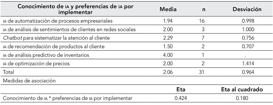 El coeficiente de eta de 0.424 indica una asociación moderada entre el conocimiento sobre IA y las preferencias que tienen las empresas en soluciones basadas en IA. Esto sugiere que las preferencias de las empresas respecto a las soluciones de IA están moderadamente influenciadas por el grado de conocimiento que tienen sobre esta tecnología.