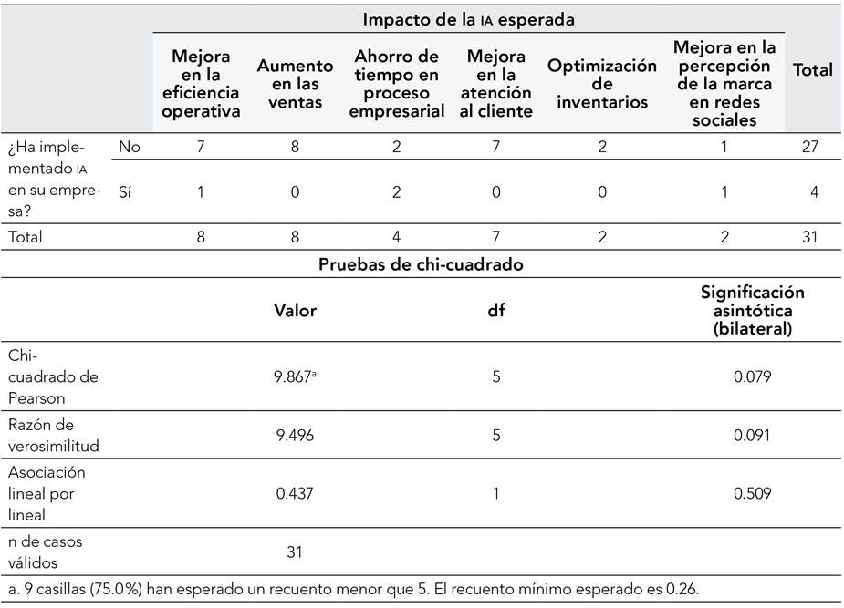 El valor de chi-cuadrado de 9.867 y una significación asintótica (bilateral) de 0.079 indican que no existe una asociación estadísticamente significativa entre la implementación de IA y el impacto esperado (ya que el valor de p es mayor a 0.05), aunque está relativamente cercano al umbral de significancia estándar. Esto sugiere que, aun cuando las empresas que han implementado IA y las que no lo han hecho tienen expectativas similares sobre los beneficios potenciales de la IA, no hay suficiente evidencia para afirmar que la implementación de ia esté relacionada de manera significativa con los impactos esperados en esta muestra.