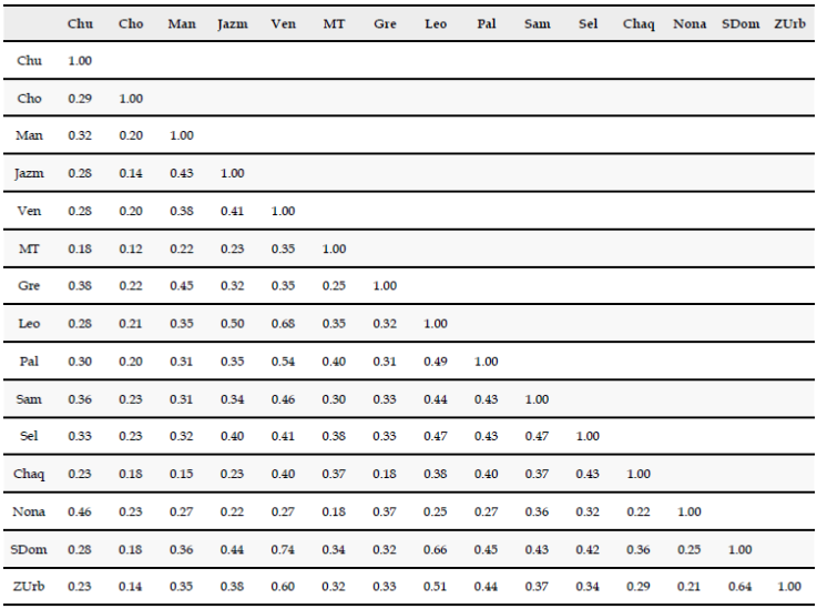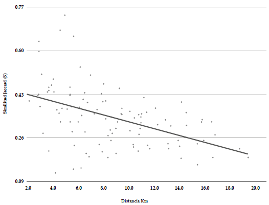 Figura 3 Relación entre la similitud en la composición de aves y la distancia geográfica entre 15 localidades del paisaje rural del oriente de Risaralda, Colombia.