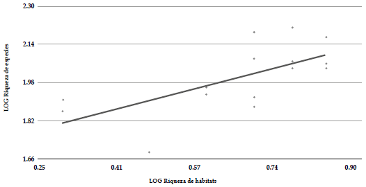 Figura 4 Relación entre la riqueza de tipos de vegetación por localidad y la riqueza de especies de aves en 15 localidades del paisaje rural del oriente de Risaralda, Colombia.