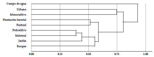 Los tipos de vegetación que presentan mayor afinidad en la composición de su avifauna, corresponden a aquellos con mayor diversidad en su estructura vertical (policultivo, matorral, bosque y jardín), mientras que los cuerpos de agua, las zonas urbanas y los monocultivos contienen conjuntos de especies más diferenciados respecto a los demás hábitats (Figura 5). Sin embargo, todos los tipos de vegetación en el paisaje rural aportan a la diversidad. En el ensamblaje de aves del paisaje estudiado, destacamos la importancia de los bosques (ca. 80 % de las especies) y los matorrales (más del 50 %); además observamos 103 especies (33.1 %) usando los pastizales y 41 especies (13.2 %) usando el hábitat urbano (Figura 6).