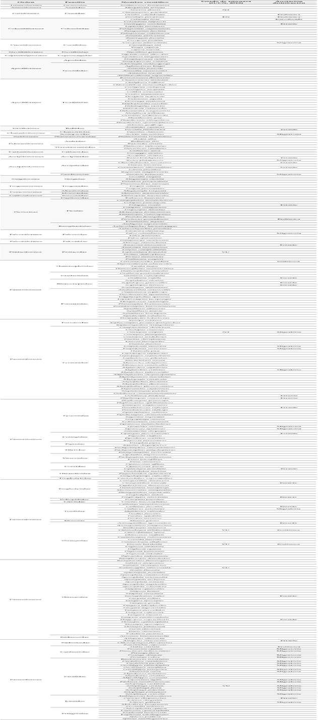 La identidad de las especies la determinamos usando las guías de campo de Hilty & Brown (2001) y McMullan (2011). Para la nomenclatura taxonómica seguimos la propuesta de la SACC (Remsen et al., 2018; en: http://www.museum.lsu.edu/~Remsen/SACCBaseline.htm) y para la información sobre el status de conservación revisamos la base de datos de IUCN (2018; https://www.iucnredlist.org/search) y el Libro rojo de las aves de Colombia (Renjifo et al., 2014). El endemismo de cada especie lo determinamos con base en la revisión de Avendaño et al. (2017).