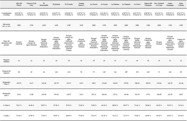 En el paisaje rural cafetero del oriente de Risaralda obtuvimos un total de 11732 registros, que corresponden a 22 órdenes, 50 familias y 309 especies de aves. El listado representa un 85 % del total de especies calculadas por el estimador Chao 2 y un 85.5 % de las calculadas por el estimador Jack 1. En las localidades que estudiamos, alcanzamos una representatividad promedio de 75.90 % ± 10.61 % para el estimador Chao 2 y de 76.21 % ± 6.24 % para el estimador Jack 1 (Anexo 2).