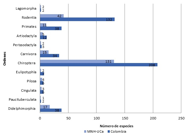 Descripción. La base de datos está conformada por 2112 registros de mamíferos (Mammalia) de los órdenes Didelphimorphia, Paucituberculata, Cingulata, Pilosa, Eulipotyphla, Chiroptera, Carnivora, Perissodactyla, Artiodactyla, Primates, Rodentia y Lagomorpha (Tabla 1; Figura 1). También se incluye información de 41 familias (38 nativas y 3 exóticas: Cercopithecidae, Muridae y Suidae), 122 géneros (116 nativos y 6 exóticos: Felis, Macaca, Mesocricetus, Mus, Rattus, Sus) y 202 especies (195 nativas y 7 exóticas: Felis catus, Macaca nigra, Mesocricetus auratus, Mus musculus, Rattus rattus, Rattus norvegicus, Sus domesticus). El número de especies de mamíferos nativos depositados en la colección del MHN-UCa (195 especies) abarca aproximadamente el 37 % de las especies presentes en Colombia (Ramírez-Chaves et al., 2019). Es de destacar que, en los dos últimos años (2018-2019), ha habido un incremento en el número de especies (23) y registros (612) con respecto a valoraciones previas (179 especies y 1500 registros evaluados por Castaño Ramírez & Ramírez-Chaves, 2018). Además, se resalta el número de especies de mamíferos del departamento de Caldas presentes en la colección (Tabla 2), que en la actualidad cuenta con 167 especies, nueve más de las reportadas previamente (Castaño Salazar, 2012).