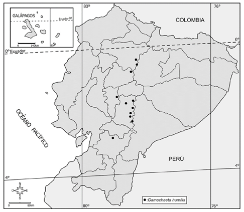 Hasta la fecha, cuatro especies de Gamochaeta [G. americana (Mill.) Wedd., G. purpurea (L.) Cabrera, G. pensylvanica (Willd.) Cabrera, G. sphacelata (Kunth) Cabrera] fueron citadas para Ecuador, y otras dos [G. filaginea (DC.) Cabrera, G. humilis Wedd.] fueron reportadas como dudosas (Jørgensen & León-Yánez, 1999; Luteyn, 1999; Pruski 2018).