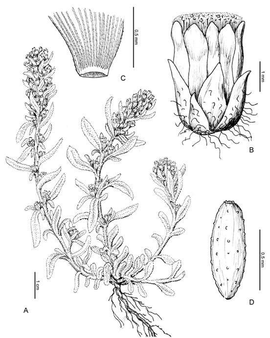 Figura 7 Gamochaeta subfalcata. A, hábito; B, capítulo; C, detalle de la base del vilano, mostrando los pelos unidos; D, aquenio con tricomas cortos y globosos [A-D: Cabrera, 1978].