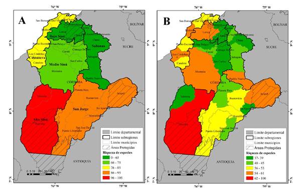 La actualización de la lista incrementa la riqueza de especies para Chiroptera (de 53 a 61), Cetacea (de 11 a 18), Rodentia (de 12 a 17), Didelphimorphia (de 5 a 7), Carnivora (de 14 a 15) y Primate (de 6 a 7). Con estos cambios, la subregión Alto Sinú presenta la mayor diversidad de mamíferos, con 101 especies registradas, que corresponde al 71.6 % de la riqueza de mamíferos del departamento de Córdoba, seguida por la subregión San Jorge (Figura 1). El municipio con mayor riqueza de mamíferos es Tierralta, con 100 especies, seguido de Montería, con 61 especies, Ayapel y Moñitos, con 59 especies cada uno, seguidos de Pueblo Nuevo (57), Lorica (56) y Los Córdobas (55).
