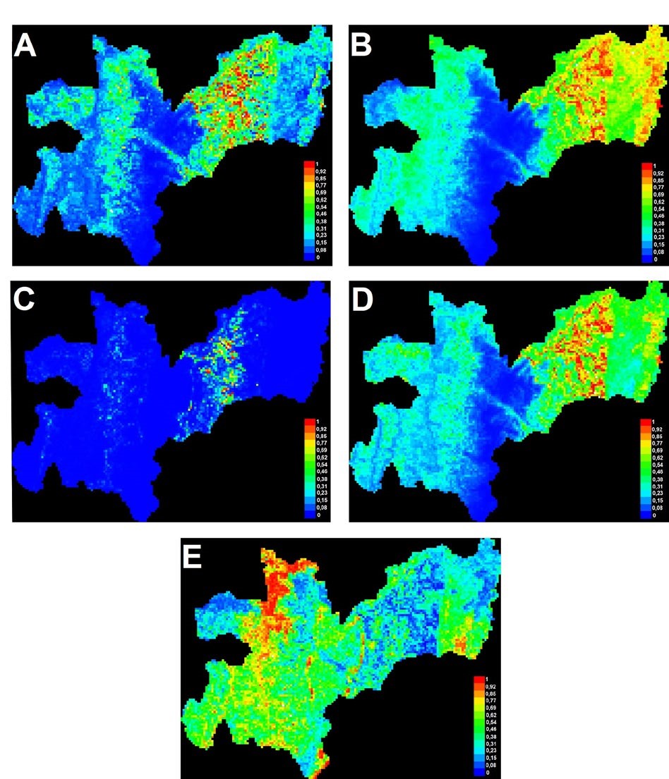 Figure 5 Potential distribution models of freshwater crabs Decapoda Pseudothelphusidae from the department of Caldas Colombia A Hypolobocera bouvieri B Phallangothelphusa dispar C Strengeriana florenciae D Strengeriana maniformis and E Strengeriana fuhrmanni Figure 5. Potential distribution models of freshwater crabs (Decapoda: Pseudothelphusidae) from the department of Caldas, Colombia. A) Hypolobocera bouvieri, B) Phallangothelphusa dispar, C) Strengeriana florenciae, D) Strengeriana maniformis, and E) Strengeriana fuhrmanni.