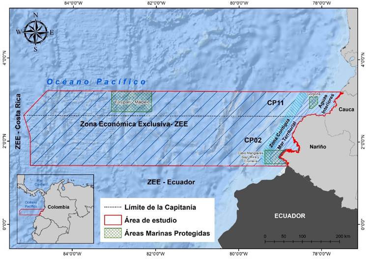 Área de estudio. La delimitación de las CP está regulada por la Resolución 0825 de 1994 (DIMAR, 1994) documento legal que establece los límites oficiales de cada CP como espacio geográfico para la administración y gestión de los litorales colombianos, incluyen toda la jurisdicción costera y espacios marítimos hasta la Zona Económica Exclusiva (ZEE) de Colombia. La primera CP corresponde a Tumaco (CP02) localizada entre las coordenadas geográficas 02° 37’ 20” N y los 78° 24’ 20” W, hasta el límite de frontera de Colombia con Ecuador localizada entre los 01° 25’ 00” N y los 78° 54’ 50” W. Asimismo, Guapi (CP11) se encuentra localizada desde la Boca del Río Naya entro los 03° 13’ 00” N y los 77° 34’ 00” W hasta los 02° 37’ 20” N y los 78° 24’ 20” W, además de incluir las Islas de Gorgona, Gorgonilla (Figura 1). Esta área representa una extensión de 147 734.19 km2.