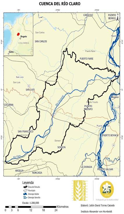 Descripción. Cuenca del río Claro, departamento de Antioquia, región del Magdalena Medio, Colombia. Esta área abarca los municipios de San Luis, San Francisco y Sonsón, y una parte de los municipios de Puerto Triunfo y Puerto Nare (Figura 1).