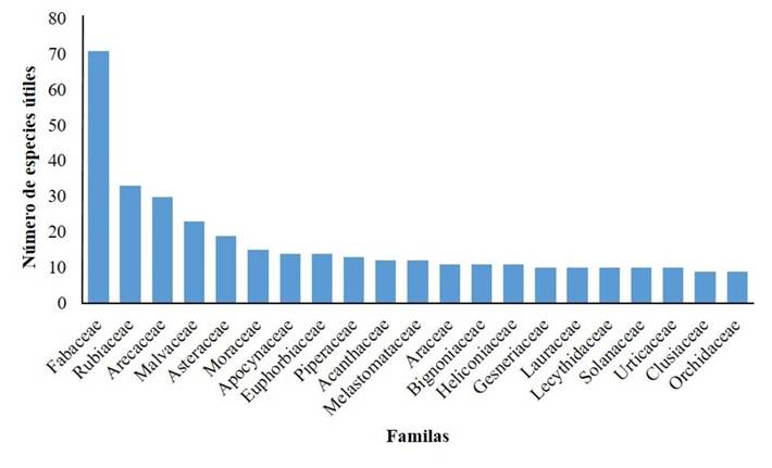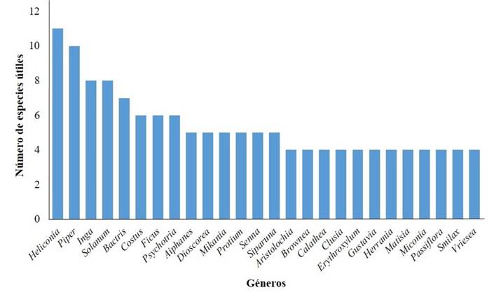 El listado de plantas elaborado en este estudio abarca un total de 650 especies nativas con usos reportados en literatura, incluyendo tres variedades y seis subespecies, y las especies nativas reportadas por las comunidades en los talleres realizados (21 especies), para las cuales también se encontraron usos reportados en literatura (Tabla 2, Tabla de este estudio). Del total de especies, 89 fueron registradas a partir de literatura y 561 de registros de herbario de colectas realizadas en la cuenca del río Claro, incluyendo las especies registradas en los talleres con la comunidad. Se registraron 122 familias y 413 géneros de plantas nativas con usos reportados en literatura, siendo Fabaceae la familia más rica en especies (con 71 especies) (Figura 3) y Heliconia el género con mayor número de especies con reporte de usos (Figura 4). Dentro del total de especies, se incluyen las siguientes 31 especies endémicas de Colombia: Abuta racemosa, Astrocaryum malybo (palma estera o lanceta), Astrocaryum triandrum (palma cabecenegro o guatinajo), Biophytum chocoense, Caryodaphnopsis cogolloi (yumbé, yumbe aguacatillo), Ciliosemina purdieana, Cischweinfia colombiana (orquídea), Clusia alata (chagualo), Compsoneura claroensis (palo papa, soto sangre), Cyathea paisa (Sarro), Cybianthus cogolloi, Dioscorea santanderensis (bejuco), Duguetia antioquiensis (piño), Grias haughtii (membrillo o coco espárrago), Gustavia romeroi (mulamuerta), Heliconia lentiginosa (heliconia), Herrania laciniifolia (cacao de monte), Isidodendron tripterocarpum (marfil), Jacaranda hesperia (gualanday), Justicia phytolaccoides (aborrecedora), Ladenbergia magdalenae (carnefresca), Magnolia silvioi (guanábana de monte o molinillo), Melicoccus antioquensis (mamoncillo de monte), Mendoncia antioquiensis, Myrcia killipii, Nautilocalyx antioquensis (toje), Pseudomalmea boyacana (anón de monte), Qualea lineata (amancayo, bomo, cascajero), Swartzia macrophylla (guacharaco, rumbo o macuná), Vantanea magdalenensis (marfil o masaba) y Wettinia hirsuta (palma mazorca o macana).