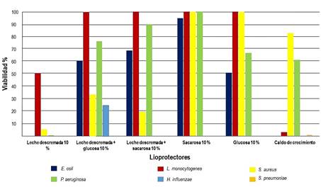 Lioprotectores. Se evaluaron tres agentes lioprotectores con algunas combinaciones. La composición evaluada en % (p.v-1) fue leche descremada 10 % (Millipore, Estados Unidos), glucosa 10 % (Fisher, Estados Unidos), sacarosa 10 % (Fisher, Estados Unidos), leche descremada con glucosa 10 %, leche descremada con sacarosa 10 %.