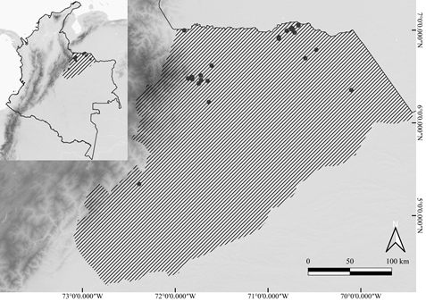 Área de estudio. El departamento de Arauca tiene una superficie de 23 818 km2 en los que se pueden encontrar llanuras aluviales, piedemonte y parte de la cordillera Oriental en el sector occidental de los municipios de Fortul, Saravena y Tame, ocupando una quinta parte del departamento, en los municipios de Arauquita, Puerto Rondón, Cravo Norte y Arauca predomina el ecosistema de sabana inundable con presencia de bosques de galería y fragmentos de bosque aislados (Rangel-Ch. y Minorta-Cely, 2014). La zona de estudio se caracteriza por un régimen de precipitación unimodal con un periodo de lluvias de ocho meses entre abril y noviembre y un periodo seco de cuatro meses entre diciembre y marzo (Rippstein et al., 2001). El departamento de Casanare se encuentra representado por dos registros recolectados en la zona urbana del municipio de Yopal que comparte características climáticas y fisiográficas con los municipios del piedemonte araucano (Tame, Fortul y Saravena).