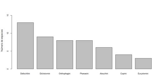 Figura 2 Número de especies de escarabajos coprófagos por tribu, depositadas en la Colección Entomológica de la Orinoquia (CEO) de la Universidad Nacional de Colombia, sede Orinoquia, en Arauca, Colombia.