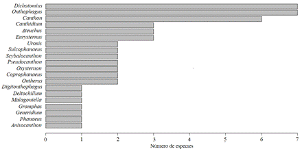 Figura 3 Número de especies de escarabajos coprófagos por género depositadas en la Colección Entomológica de la Orinoquia (CEO) de la Universidad Nacional de Colombia, sede Orinoquia, en Arauca, Colombia.