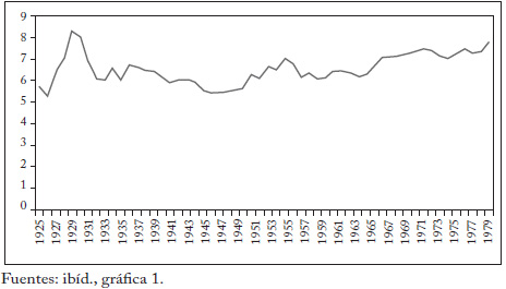 En los años veinte, la importancia relativa del comercio y las finanzas en la creación de valor agregado era similar a la del gobierno; en los años treinta, la participación de los primeros se hizo más significativa, pero a pesar de las diferencias numéricas, ambas trayectorias tuvieron rasgos similares: descenso desde los treinta, particularmente durante la segunda guerra; recuperación y ascenso durante la primera década de posguerra; nuevo ascenso entre los años sesenta y setenta, y en el primer lustro de los noventa (la gráfica 2 permite observar mejor la evolución del gobierno entre 1925 y 1980).