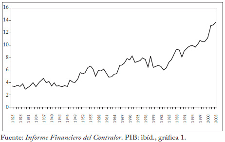 La trayectoria completa de los ingresos públicos como porcentaje del PIB se puede dividir en dos tramos. El primero desde 1925 hasta mediados de los ochenta, y el segundo, la parte restante de la serie. En el primer tramo se observan tres grandes períodos, cada uno de veinte años, caracterizados primero por un ascenso y luego por un declive; los puntos más bajos, en los que termina un período y comienza el siguiente, se alcanzan en 1925 (8,63%), 1944 (8,61%), 1963 (8,69%) y 1984 (8,89%). Los más altos también son de niveles muy similares: 13,8%, 14,2%, 14,3% y 14,8%, en 1931, 1955, 1971 y 1978 respectivamente. Así, tras un proceso recurrente de expansión y contracción de los ingresos públicos a lo largo de ciclos extendidos, a mediados de los ochenta la capacidad financiera de la administración central en sus tres niveles era similar a la de los años veinte.
