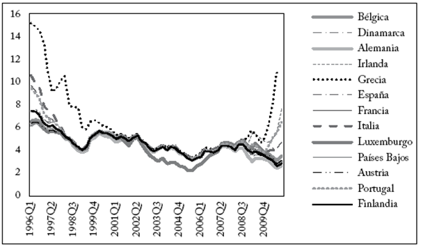 La crisis de las hipotecas basura puso en duda la sostenibilidad de la ume y de la dinámica financiera intraeuropea. Como se muestra en la gráfica 1, con datos de Eurostat, en 2009 las tasas de interés de los países de la periferia empiezan a divergir respecto a las de Alemania, a pesar de compartir la misma moneda.
