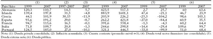 Cuadro 1 Situación financiera de Francia, Alemania y los principales países de la periferia euro antes de la crisis (Porcentaje del pib)