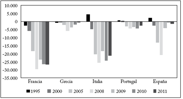Es preciso identificar dos factores financieros clave. El primero es el endeudamiento orientado a la compra de bienes extranjeros, desde el sector privado de la periferia hacia el sistema financiero del centro. En este caso el papel central de Alemania y su red productiva es crucial, como se puede apreciar en la gráfica 2, donde reportamos el saldo comercial bilateral entre los países de la periferia del euro y Alemania. Estos flujos son sostenidos por la amplia disponibilidad de crédito, determinada, a su vez, por la necesidad de los intermediarios financieros del centro de buscar destinos para el exceso de ahorro asociado al excedente externo.