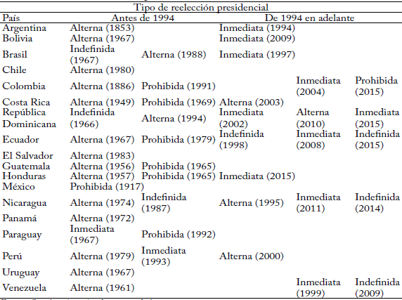 Actualmente catorce de dieciocho países latinoamericanos contemplan la figura de la reelección presidencial; seis de manera alterna, cinco de manera consecutiva (reelección inmediata) y tres de forma indefinida. La característica distintiva de los dos últimos grupos para alcanzar este objetivo ha sido la modificación constitucional a partir de 1994; usualmente por iniciativa de mandatarios que gozan de una amplia popularidad en sus países, y que cuentan con el apoyo o control del juez constitucional. La influencia de personalidades políticas y la facilidad con la que se llevan a cabo las reformas en torno a la reelección dan origen a la provisionalidad institucional propia de los gobiernos latinoamericanos.