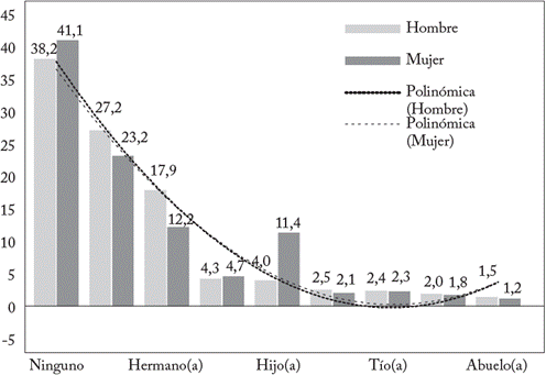 El ingreso precoz a la etapa de desesperanza puede tener varios determinantes, pero el principal es la ruptura de los vínculos familiares. Una alta proporción de los habitantes de calle, un 40%, manifestó que no tenía contacto con ningún familiar (gráfica 1), lo que indica la asociación directa de este fenómeno con la existencia de familias disfuncionales. No obstante, el hecho de que el 60% restante tenga contacto esporádico con algún familiar es un excelente indicio para que, más allá de las penas por abandono previstas en el Código Penal, las políticas procuren restablecer las relaciones familiares mediante ayuda terapéutica y, a través de ella, la reinserción simbólica y real de los habitantes de la calle. El vínculo materno es el más poderoso pues, tanto en el caso de los hombres como en el de las mujeres, la madre es el familiar con el que al menos una cuarta parte procura mantener contacto y, de manera complementaria, el 11,4% de las mujeres buscan mantenerlo con sus hijos.