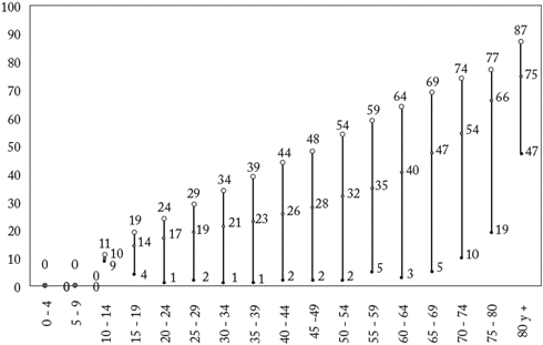 El límite inferior de la retrospectiva de edad de llegada a la calle indica que hasta el grupo de 65 a 69 años (gráfica 3), hay personas que llegaron con cinco años de edad o menos. También revela que llegan personas de cualquier edad y los rangos se ensanchan hasta ese grupo. A partir del siguiente, la amplitud de los rangos se reduce, y más en los dos últimos, fenómeno singular porque personas de mucha edad (máximo 87 años) llegan a habitar en un medio hostil en la etapa de desesperanza, cuando ven a diario que sus funciones físicas y mentales son frágiles como en ninguna otra etapa de su vida. La exploración sugiere, como rasgo característico de los habitantes de calle entrevistados, que ese ciclo se hace evidente a las pocas semanas de llegar a esa situación, con independencia del grupo de edad al que pertenezcan; esto es, que el ciclo mortal de las personas, la etapa de desesperanza, se anticipa décadas al llegar a la calle.