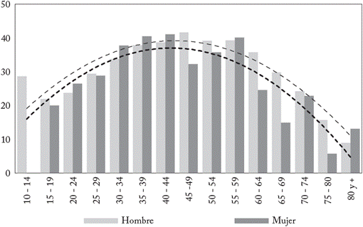 Cómo expresión de la entrada en la etapa de desesperanza o ciclo mortal de los habitantes de la calle, la gráfica 4 muestra el porcentaje de vida que acumulan en promedio viviendo en tal condición. La distribución polinómica de grado dos, la que mejor se ajusta a la tendencia observada, sugiere que entre los grupos de mayor edad ese porcentaje es menor, pues la mayoría de sus miembros llega a habitar en la calle a edad avanzada. Esto indica que en este grupo de edad se presenta con mayor intensidad el desahucio en la vejez. Los hombres de 45 a 49 son los que más tiempo llevan habitando en la calle (41,6%). La distribución de las mujeres es levemente inferior; de modo que en el ciclo mortal no hay una diferencia significativa entre sexos.