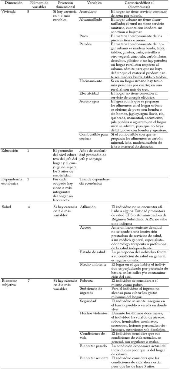 Se consideran cinco dimensiones: vivienda, educación, dependencia económica, salud y bienestar subjetivo; integradas por 21 variables. Vivienda, salud y bienestar subjetivo se construyeron a partir de la carencia o no de variables dicotómicas simples o compuestas, es decir, en las opciones de respuesta múltiple las variables se dicotomizaron para identificar carencias en cada variable, y la privación en cada dimensión corresponde a la sumatoria de los déficits y su comparación con el umbral dimensional. Las brechas dimensionales se calcularon a partir de la diferencia entre el umbral establecido y el número de variables en las que no había carencia.