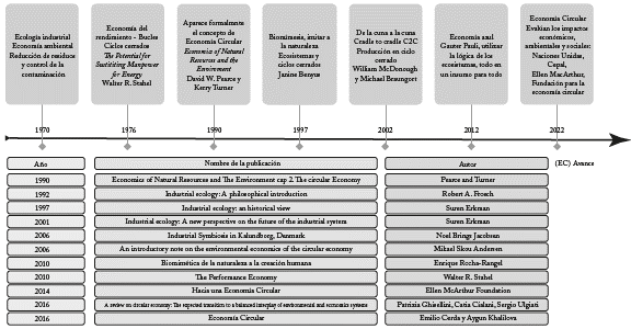 Se elaboró un mapa conceptual para representar una línea de tiempo identificando las principales ideas y exponentes de la EC, nombre del autor y año de la publicación, lo cual permitiría analizar y seleccionar la información relevante a medida que se avanzaba en la redacción de la investigación. Un aporte importante del mapa conceptual es contar con una mirada acerca del origen y avance de la EC en las últimas décadas. Para todos los estudios seleccionados se revisaron las conclusiones y resultados encontrados. A continuación, se presenta mapa conceptual que resalta la evolución de la economía circular en el tiempo: