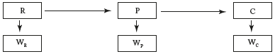 Fuente: Elaboración propia a partir de (Pearce & Turner, 1990, pág. 36). R = Flujo de recursos naturales P = Producción C = Bienes de consumo WR = Residuos de la naturaleza (Sistema natural de reciclaje - Todo es un insumo para todo) WP = Residuos de la producción (La producción genera desechos en forma de efluentes industriales y contaminación del aire y desechos sólidos) WC = Residuos del consumo (los consumidores finales crean desechos al generar aguas residuales, basura y desechos municipales).
