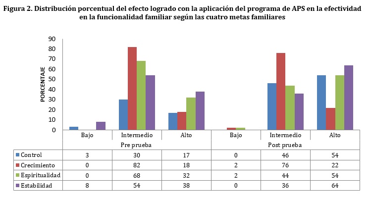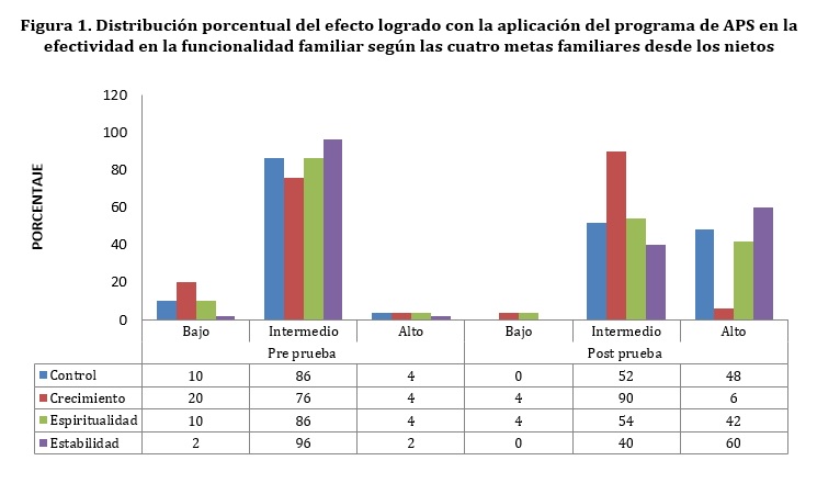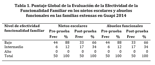 A nivel general, se destaca que tanto nietos como abuelos estiman de manera similar la baja funcionalidad de sus familias y mostraron cambios de la funcionalidad familiar después de aplicado el programa de APS, disminuyendo el nivel bajo (88% en la preprueba a 66% en la posprueba), y aumentando el nivel intermedio de la efectividad de la funcionalidad familiar (pasó de 12 a 34%) (Tabla 1).