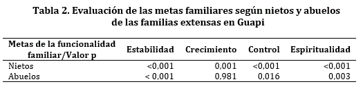 Por tanto, la tabla 2 evidencia que la aplicación del programa de APS tiene un efecto estadísticamente significativo desde los nietos y los abuelos en la efectividad de las metas de funcionalidad familiar en las familias afrocolombianas del municipio de Guapi Cauca.