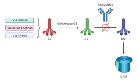 Figura 1 Mecanismo de acción del eculizumab. Elementos del complemento: C3-C5-C5b. Complejo de ataque a membranas: CAM. Elaboración propia. Imagen creada con BioRender.