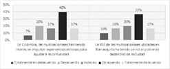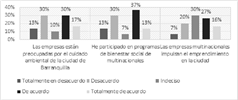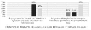 Al respecto de los datos observados, llama la atención que, en porcentajes iguales (30%), las personas se encuentran de acuerdo y en desacuerdo con que dichas organizaciones se preocupan por el cuidado del medio ambiente; situación que resulta similar con la evaluación del criterio de bienestar social; además, en cuanto al aspecto de emprendimiento la mayoría de los encuestados se manifiestan indecisos. Lo anterior permite establecer la existencia de una percepción generalizada que piensa que las multinacionales no se preocupan realmente por el desarrollo humano, ambiental y social de la comunidad.