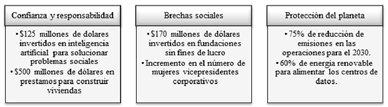 Reconocida mundialmente por sus desarrollos en software y servicios en la nube. Sus grandes resultados le han permitido influir positivamente en áreas de innovación, diversidad e inclusión, filantropía, medio ambiente y seguridad informática; de esta manera, sus estrategias de RSE se fundamentan en el desarrollo de la confianza y la responsabilidad, el cierre de brechas sociales, y la protección del planeta.