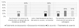 Los resultados mostrados indican que el 80% de los empresarios consideran que los programas de RSE integran los grupos de interés de las organizaciones, a la vez que se realizan de forma desinteresada en favor del entorno social y ambiental; sin embargo, la intervención del extranjero es evaluada de forma diferente, ya que el 20% de los encuestados no consideran su intervención, mientras que el 40% se encuentra indeciso en su evaluación. Con el fin de enfatizar en los hallazgos, se presenta la figura 5.