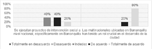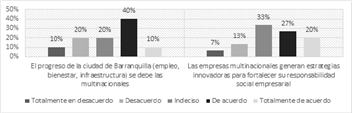 Así mismo, el análisis del rol de las multinacionales en la ciudad de Barranquilla, en referencia a su desempeño en RSE, permitió establecer que los empresarios de la ciudad consideran que éstas han logrado un desempeño positivo en el impacto social de sus programas de desarrollo. Sin embargo, desde el punto de vista de los ciudadanos, los resultados son menos favorables, ya que aunque prima la percepción positiva de la gestión, cuenta con gran relevancia los aspectos negativos; dejando entrever que no se consideran importantes las acciones de las multinacionales para la construcción de tejido social, o se tiene desconocimiento de la verdadera gestión ejercida por dichas organizaciones.