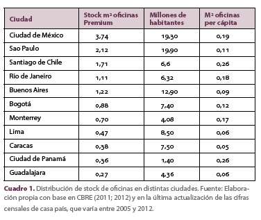 La acumulación de metros cuadrados de oficinas Premium en el contexto latinoamericano no necesariamente tiene una relación directa con el tamaño de las ciudades ni con el de las economías. Así, las tres ciudades con mayor stock son Ciudad de México (3,7 millones de m2), Sao Paulo (2,1 millones de m2) y Santiago de Chile (1,7 millones de m2), de acuerdo con los datos proporcionados por Richard Ellis (CBRE, 2011; 2012) (véase Cuadro 1). Al respecto, es importante destacar que estas ciudades abarcan el 56% del mercado latinoamericano de oficinas Premium.