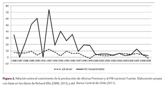Las condiciones extraordinarias para los negocios que generaron las reformas continuadas por los gobiernos democráticos chilenos en todas las áreas de la economía (mercado financiero, comercio exterior, entre otros), sumados a la estabilidad política y social, a la existencia de la Unidad de Fomento5 como unidad de cuenta para el mercado inmobiliario, la baja tasa de interés, su comportamiento relativamente estable y los niveles altos de disponibilidad de capital tanto nacional como internacional, tuvieron un profundo impacto en la producción de oficinas Premium, tal como se observa en la Figura 1.