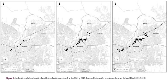 Santiago do Chile tem o terceiro maior estoque de imobiliário corporativo de classe A da América Latina, depois de São Paulo e Cidade do México. Este estoque aumentou nas últimas décadas devido à competitividade do país, à internacionalização das empresas nacionais e como efeito da evolução do modelo de negócios do mercado de escritórios, no qual a financeirização tem um papel central. A evolução territorial dos escritórios se há caracterizado por uma mudança dos padrões de localização, que inicialmente se expandiu em direção ao oriente da cidade, no eixo Providencia-Nova Providencia, até encontrar um nicho no bairro El Golf, do município de Las Condes. Por esta razão, em um princípio essa nova geografia corporativa se caracterizou por um padrão de crescimento que se estendia de forma linear, no entanto, hoje em dia esse padrão foi substituído pela descontinuidade e a fragmentação, transformando a estrutura da cidade e gerando uma ampliação do centro metropolitano.