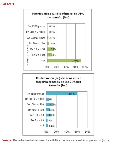 En este país, según datos revelados por el Departamento Administrativo Nacional de Estadística (DANE), el 0,4% de las unidades de producción agropecuaria representan el 42% del área censada, con unas extensiones que superan las 500 hectáreas. Y el 70% de las Unidades de Producción Agropecuaria del país (UPA), con extensiones de menos de 5 hectáreas representan el 5% del área censada.