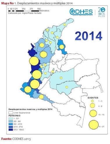 Quizá uno de los fenómenos más dramáticos que denotan la asociación entre órdenes territoriales y geografías de la guerra es el del desplazamiento forzado. En aquellos departamentos donde se registra una presencia numerosa de grupos armados son más recurrentes este tipo de hechos victimizantes. El mapa de COD-HES para el año 2014 permite identificar las regiones del país con mayor número de eventos. Estos territorios coinciden con los registros gubernamentales sobre presencia de más de dos actores armados.
