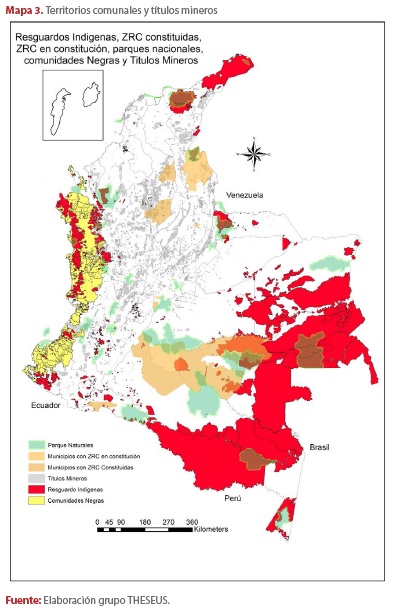 4 Cuando hablamos de territorios comunitarios nos referimos a aquellas porciones físicas del espacio geográfico en las cuales grupos sociales de carácter popular han dinamizado un tipo de relacionamiento territorial que no se define a través de la racionalidad del dinero. Por ejemplo Zonas de Reserva Campesina, Resguardos indígenas, Palenques, Comunas, Acueductos comunitarios, territorios urbano-populares.